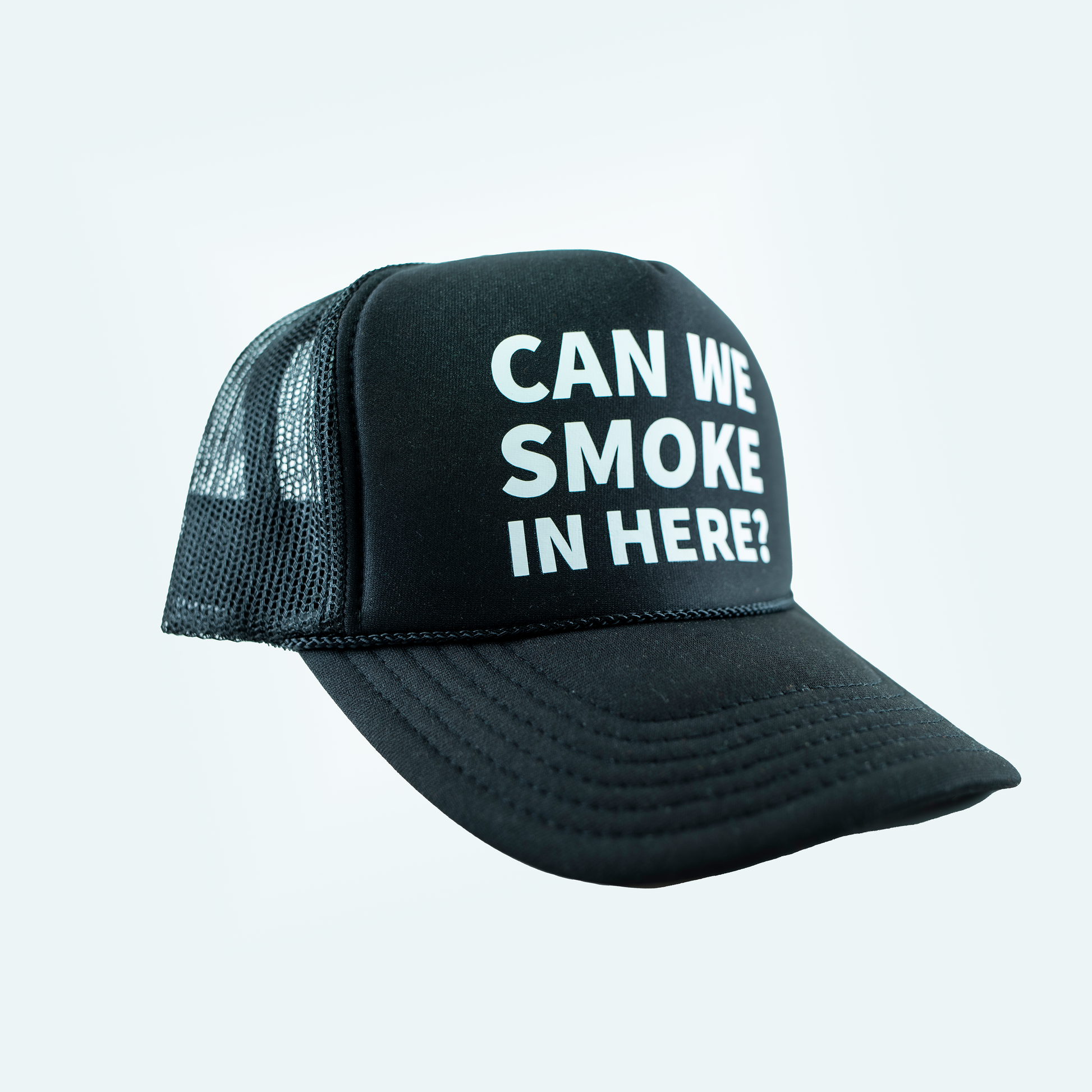 The original Can We Smoke In Here? box logo trucker hhat in black.